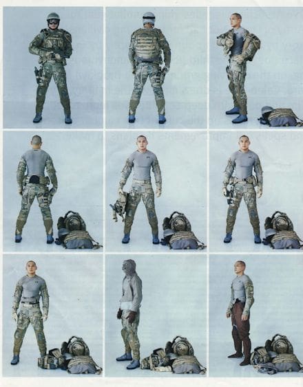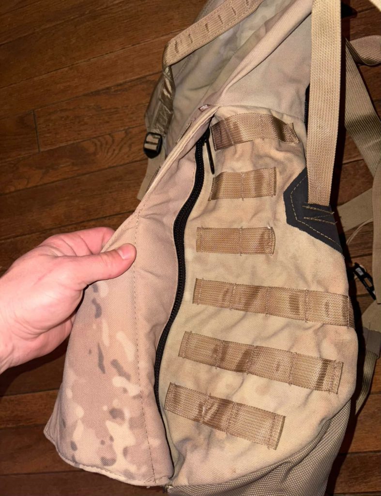 Here we have the Assault pack style design that was integrated in to one of the commonly depicted ensembles. It was originally Scorpion camo (pre MC) but this early fabric has faded over time. While it was shown being worn with the early CAGE, there are backpack straps which are quite normal. Centre image shows the lower side straps clipped in to the vest rather than being a normal waist strap.