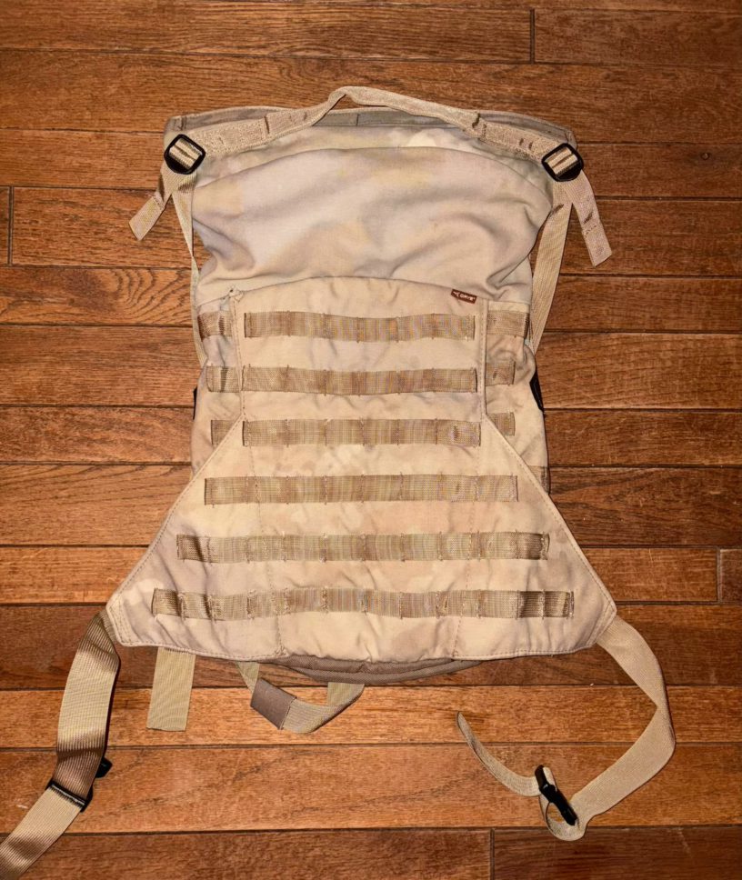 Here we have the Assault pack style design that was integrated in to one of the commonly depicted ensembles. It was originally Scorpion camo (pre MC) but this early fabric has faded over time. While it was shown being worn with the early CAGE, there are backpack straps which are quite normal. Centre image shows the lower side straps clipped in to the vest rather than being a normal waist strap.