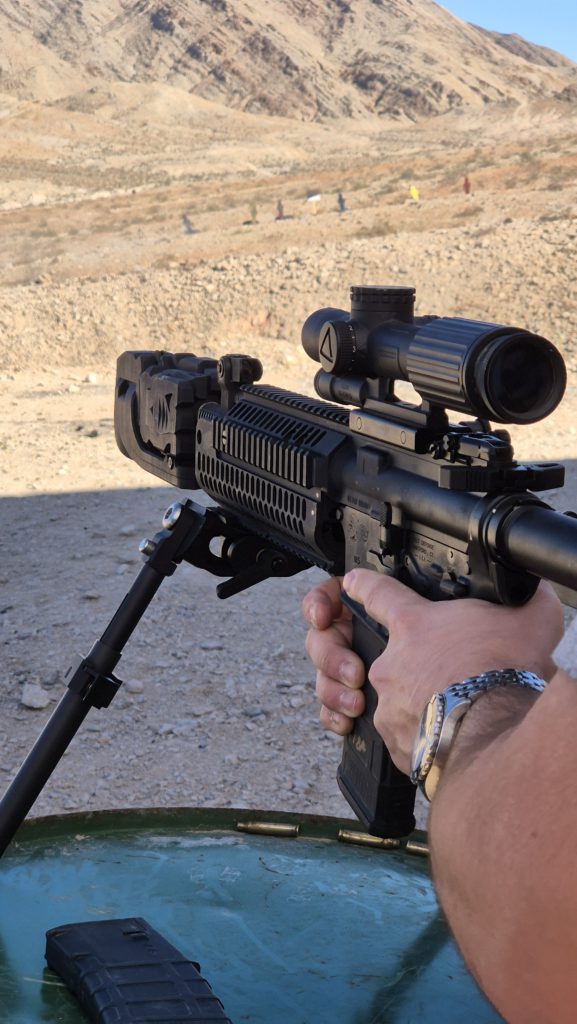 The capabilities of the full power military round are extensive that much we know. However I’ve handled probably 150-200 different guns of alllll kinds the past few days, and I’m afraid I have to say these were the heaviest for their size, and in particular the most noticably front heavy. All there is at the back is a nice, light and empty AR buffer tube with a nice, light Magpul stock on it. But in front of the pistol grip you have a seriously beefy BCG, barrel and gas system to handle the massive pressure in the system which deliver that terminal performance.