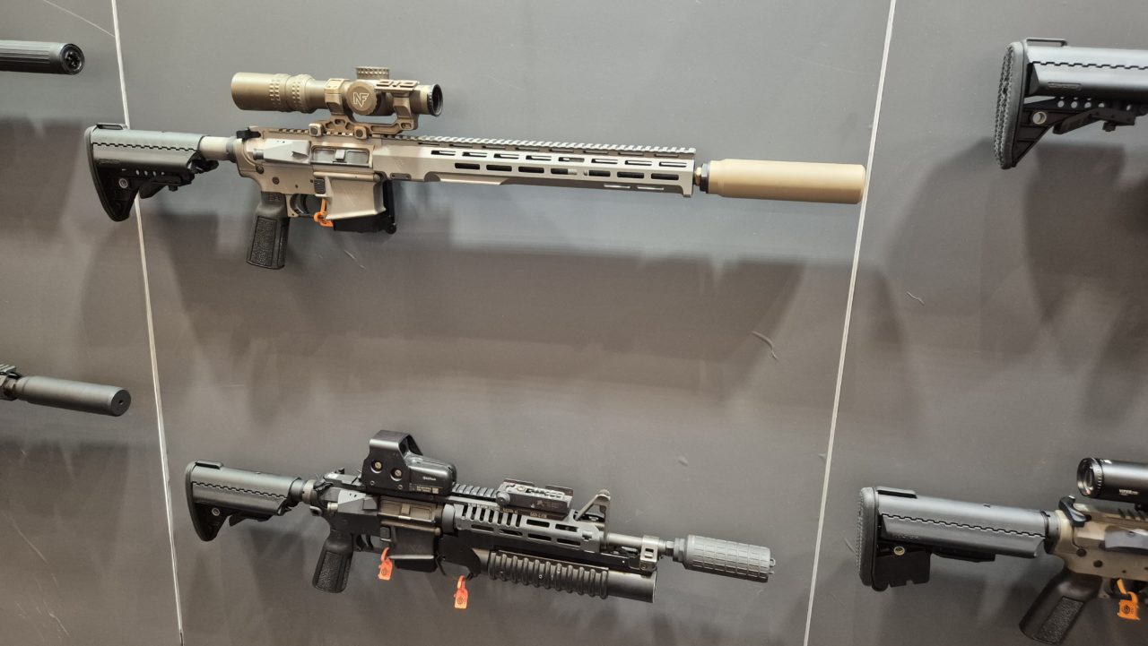 The top image is from @thefirearmblog showing a replica HK416F. The bottom image is one I took at the @navyarmsfirearms booth with replicas of the FAMAS F1/G1 and an M92 variant (the one they used in service was called the PAMAS G1).